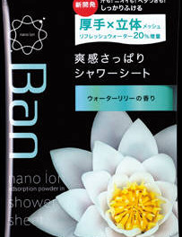 「Ban(バン) 爽快さっぱりシャワーシート ウォーターリリーの香り 10枚入」は、ナノイオン吸着パウダー配合、汗もニオイもベタつきもしっかりふけるデオドラントシートです。ナノイオンパウダーが汗やニオイをしっかり吸着。厚手*立体メッシューシートだから、1枚で全身の汗・ベタつき・ニオイまでしっかり取り除きます。毛羽立ちにくく、肌にやさしいふき心地です。シートにたっぷり含んだリフレッシュウォーターが、素肌を包み、長時間ひんやり爽快感が持続します。肌がかさつきません。また、パウダーの白残りもありません。スポーツ後、学校やオフィス、人と会う前などに。ワキの下、首筋、胸元など、全身にお使いいただけます。ウォーターリリーの香り。
