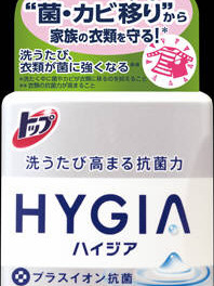 「トップ HYGIA(ハイジア) 本体 450g」は、洗浄力と抗菌力で衣類の菌の増殖やニオイの発生を未然に防ぐコンパクト洗剤(衣類用)です。汚れもしっかり落とす確かな洗浄力。タンパクや皮脂の汚れもしっかり落とします。すすぎは1回でOK。従来の液体洗剤(当社トップクリアリキッド)の半分の使用量で洗えます。スッキリした、ミンティーグリーンの香り。プラスイオン抗菌。100%天然ハーブ、ティーツリーオイル配合。つめかえ用。360g入。洗うたび、衣類が菌に強くなる予防発想のお洗たくを提案する超コンパクト洗剤です。洗たく槽の菌が作るバイオフィルムまで分解・除去します。つめかえ用。360g入。●多糖分解酵素を新配合。洗たく槽のバイオフィルム汚れを直接分解・除去。●プラスイオン抗菌と菌の栄養となるタンパク汚れをしっかり落とす確かな洗浄力で独自の洗うたび高まる抗菌力を実現。●洗たく中の菌・カビ移りを抑える。●衣類の菌の増殖を防ぎ、優れた防臭効果を発揮。●100%天然ハーブ、ティーツリーオイル配合。●スッキリしたミンティーグリーンの香り、リフレッシュ。●泡切れがよく、すすぎは1回でOK。
