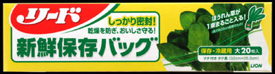 「リード新鮮保存バッグ タテ長大 20枚」は、強力密封でおいしさを守る保存・冷蔵用ジッパー付きキッチン袋です。海苔やせんべいなどの湿気を嫌う食品やパンの保存に使えます。また、酸素の透過性がよいフレッシュプロテクト素材なので、野菜や果物も鮮度を保って保存できます。内容物の目印になる食品のイラスト、目印を書き込めるメモ欄付き。ジッパーの色は緑と白、冷凍保存バッグの青と白は色分けして、より区別できます。ほうれん草や小松菜、春菊などの葉物野菜、パスタや昆布、食パンなどの保存にも便利なタテ長大サイズ。